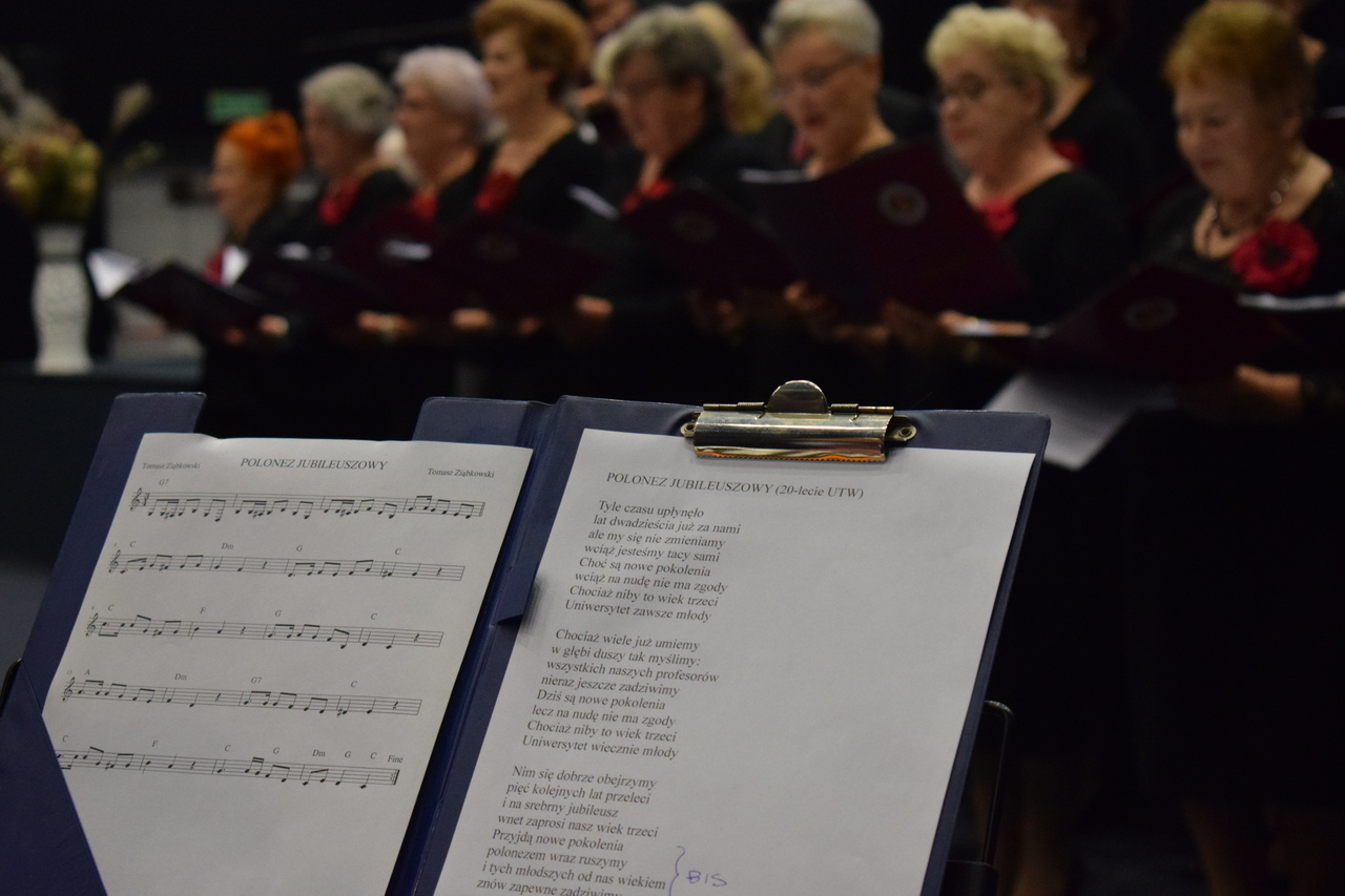Przybyłych gości oraz zebranych na gali słuchaczy Uniwersytetu przywitała Prezes Stowarzyszenia ZUTW Halina Caban oraz zespół wokalny „Gaudeamus” –  Polonezem Jubileuszowym i Hymnem Uniwersytetu „Żyjmy pełnym życiem”.